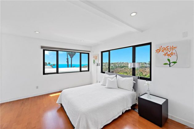 A contemporary hideaway in the hills of Laguna Beach with ocean views and a newly renovated pool and spa. This spacious retreat features vaulted ceilings, walls of glass, wood floors, limestone, and smooth stucco. Natural light fills the open living room, dining room and kitchen. A rear deck off the living room overlooks the sparkling pool and views.