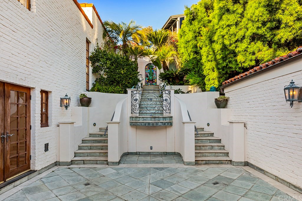 True to Mediterranean-style living, the residence is introduced by a gated courtyard revealing the home’s explosive head-on views of the Pacific. While generous in size, the home emits a sense of intimacy and romance with classic design elements including arched windows and passages, wood-framed French doors, beamed ceilings and fireplaces finished in smooth stucco. Although built more than 9 decades ago, the home has been refit with modern amenities such as an elevator, library, billiard’s room, collector’s wine room and award-worthy home theater designed by Theos Kalomirakis, complete with a concession stand and lobby. With white-water views from nearly every room and spacious grounds not often seen along the coastline, this enchanting residence promises a life of splendor. Mills Act tax incentives and access to the beach below via a gated staircase exclusive to Rockledge community residents are additional highlights.