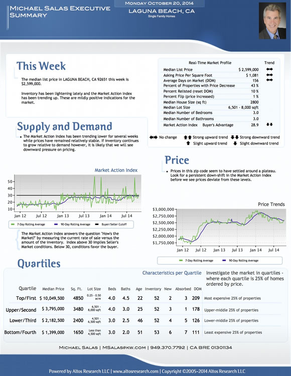 The median list price in Laguna Beach this week is $2,599,000. Inventory has been lightening lately and the Market Action Index has been trending up. These are mildly positive indications for the market.